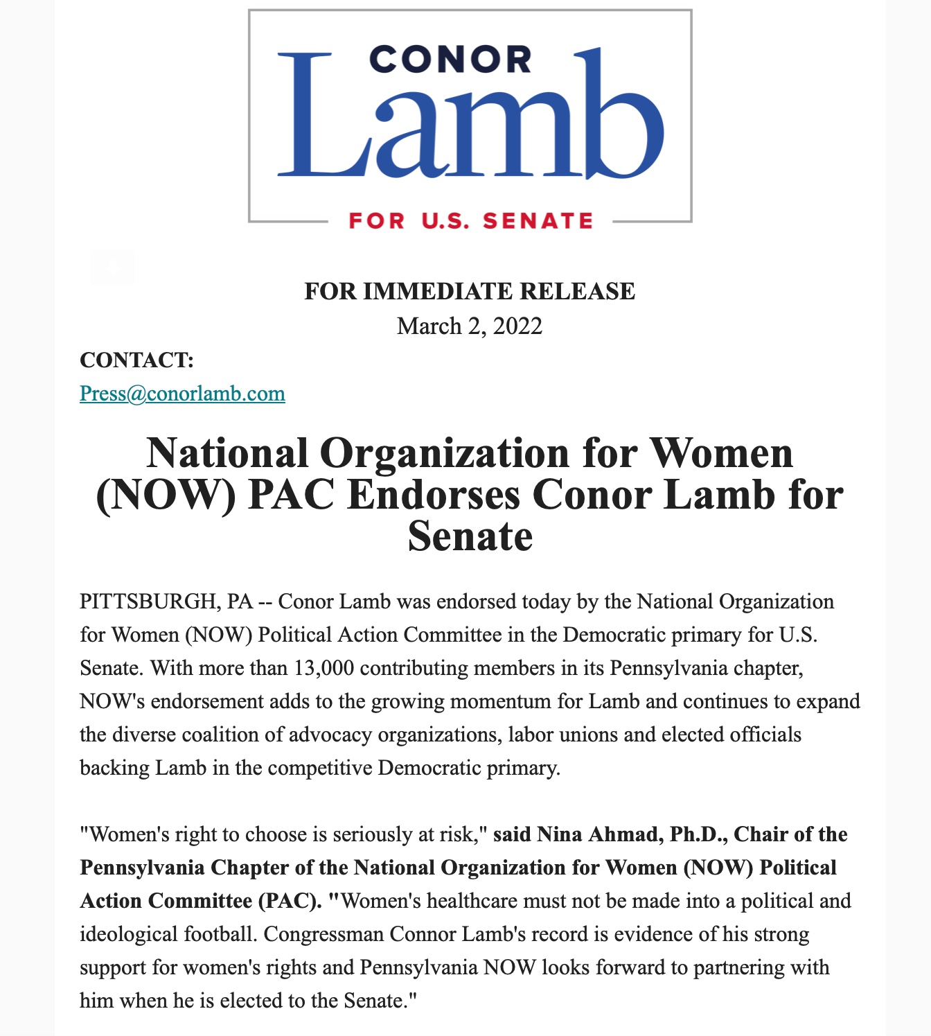 National Organization for Women (NOW) PAC Endorses Conor Lamb for Senate